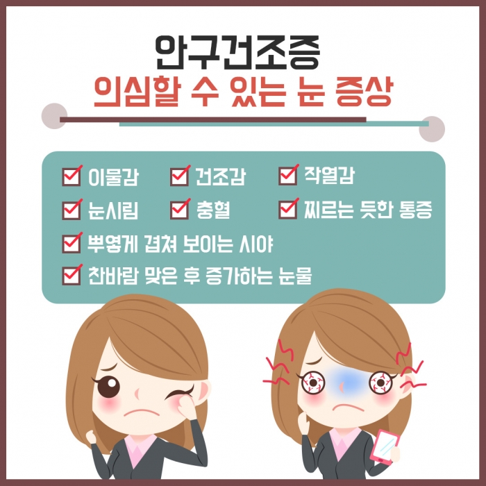 안구건조증은 눈물이 부족하거나, 눈물이 너무 빨리 증발해서 발생합니다.