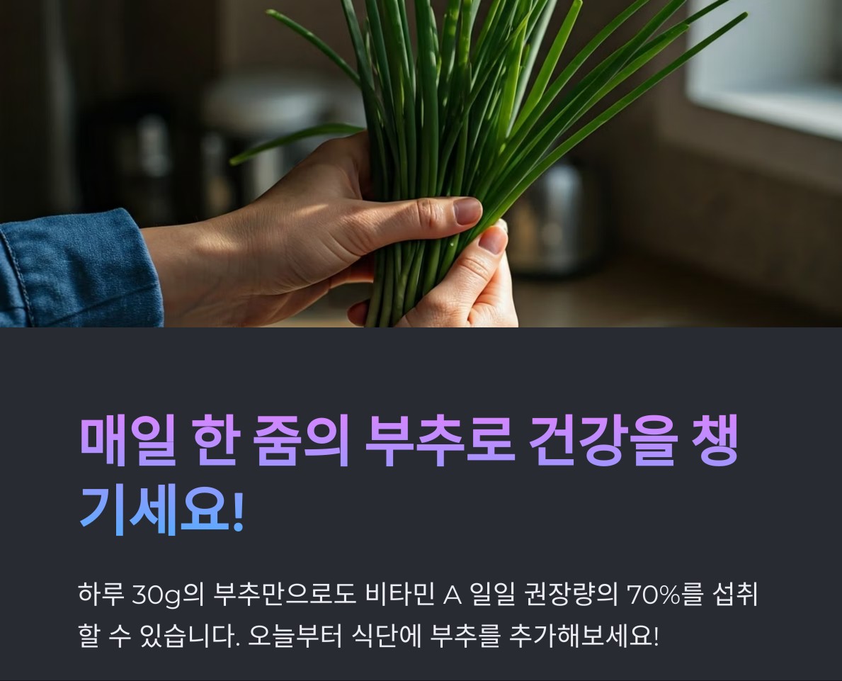 부추는 항산화 물질과 비타민이 풍부해 건강 증진에 긍정적인 영향을 줍니다.