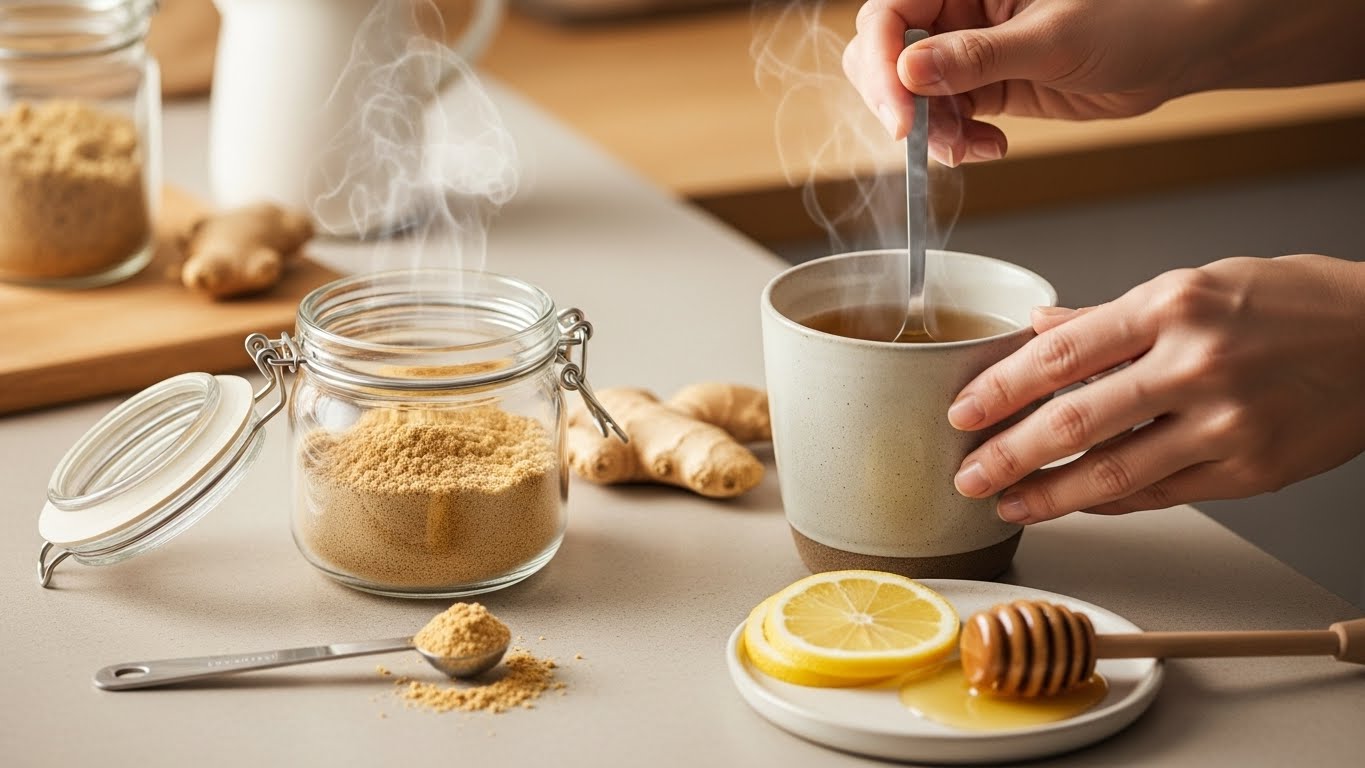 • 따뜻한 물 200–250ml + 생강가루 1/4~1/2티스푼