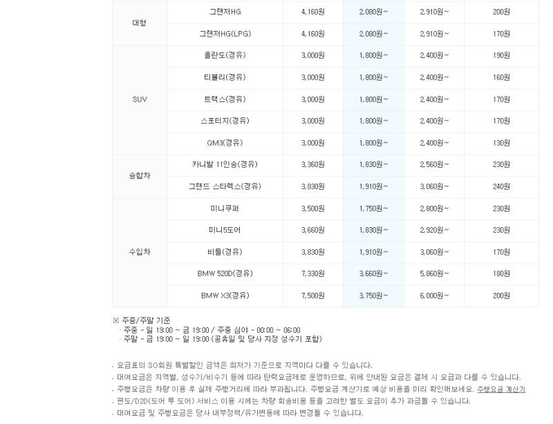 대형차, SUV, 승합차, 수입차 등 여러 종류의 차량이 있으며, 각 차량의 대여 요금은 다릅니다.