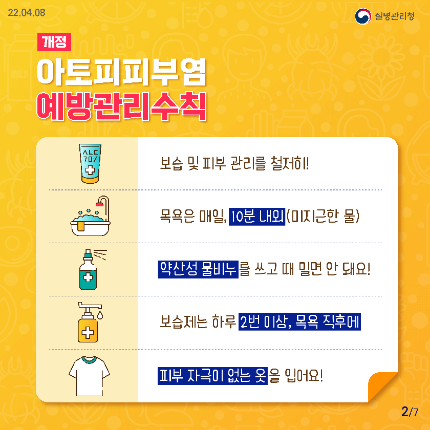 올바른 목욕 습관 : 목욕을 할 때는 따뜻한 물(32~34도)의 샤워를 10분 정도 하는 것이 좋습니다. 그리고 목욕 후에는 부드러운 수건으로 물기를 제거하고, 3분 이내에 보습제를 발라주는 것이 중요합니다