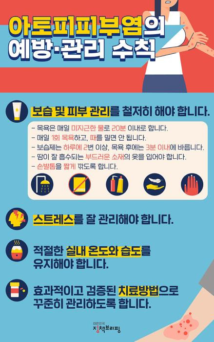 - 생활 습관 개선 : 규칙적인 생활 습관을 유지하고, 건강한 식단과 수면 습관을 가지는 것이 아토피 피부염을 예방하는 데 도움이 됩니다.