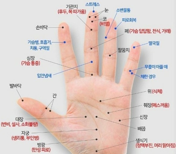 손바닥에는 다양한 지압점이 존재하며, 이들은 신체의 여러 부위와 연결되어 있습니다.