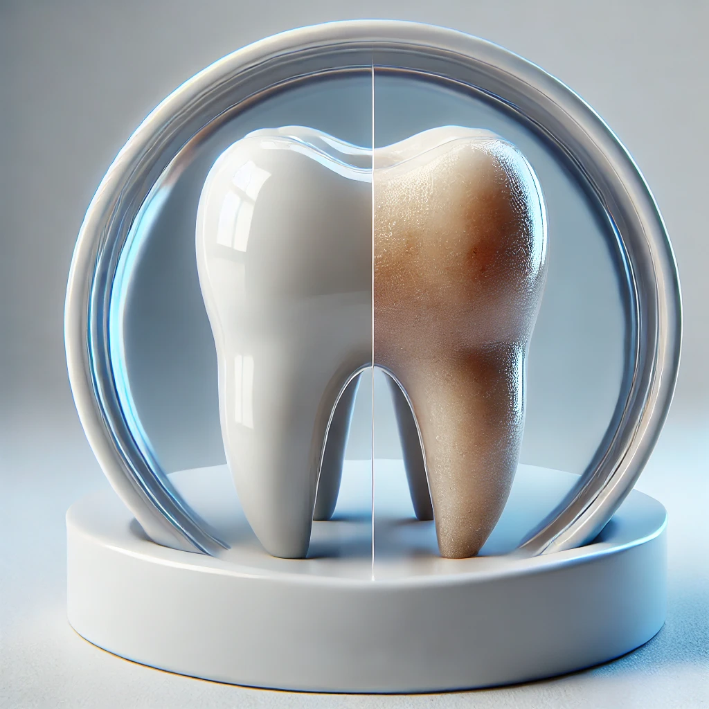 플라그가 굳어져 단단해진 물질로, 치아 표면에 부착됩니다.