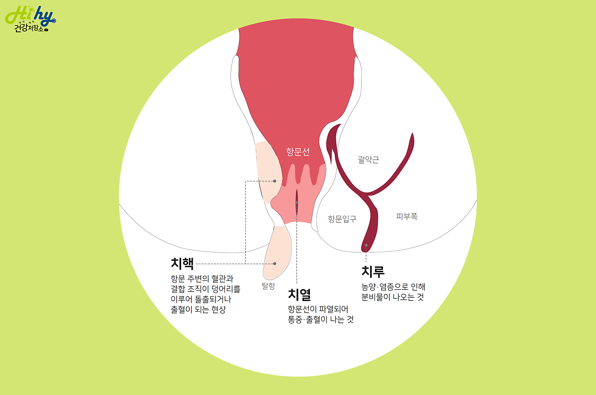 - 치열: 항문 내벽 혹은 항문과 피부 경계 부위가 찢어지며 발생하는 병