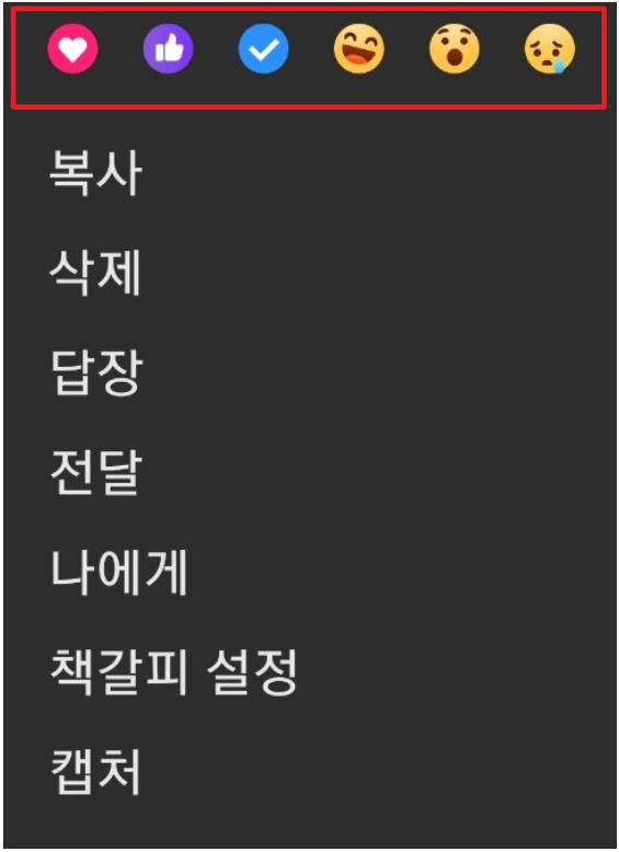 받은 글이나 사진, 동영상을 꾹 누르고 있으면, 위에 6개의 공감버튼이 보입니다.