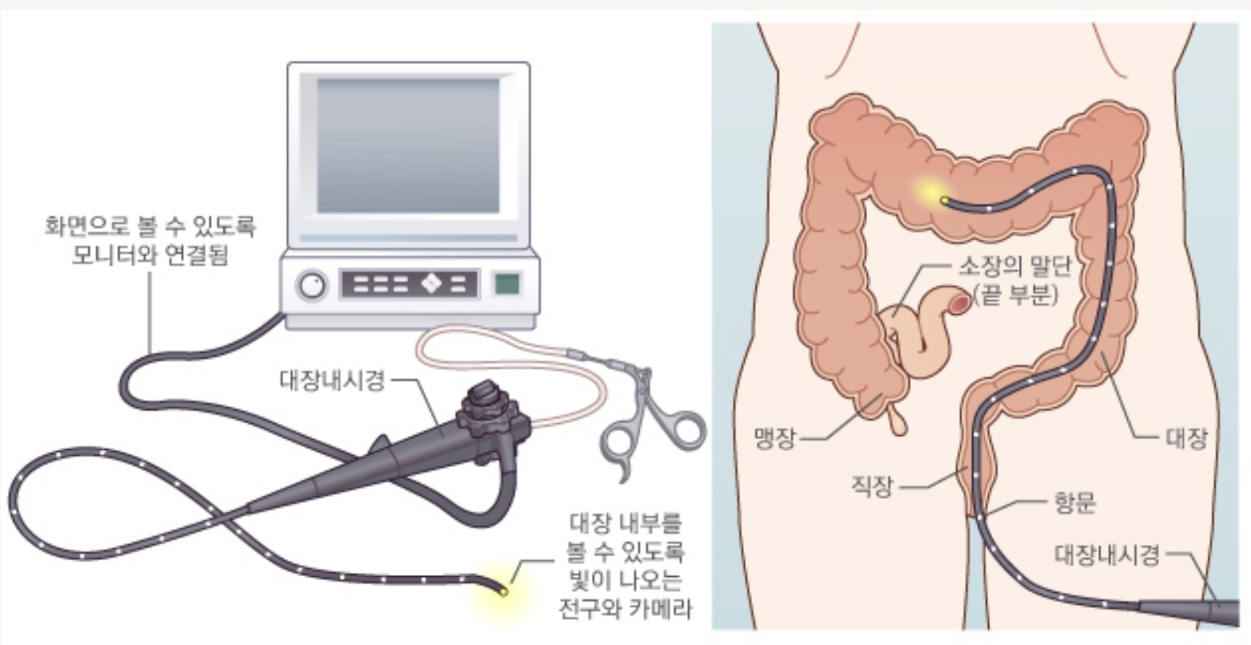 * 검사 진행: 의사가 항문을 통해 내시경을 삽입하여 대장 내부를 꼼꼼하게 살핍니다.