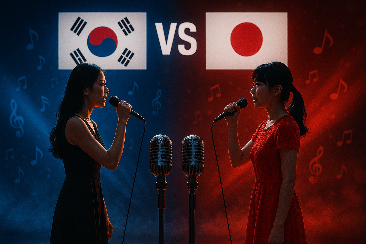 한국 트로트는 서정성과 감정선이 강조되는 반면, 일본 트로트는 음계의 다양성과 퍼포먼스 중심 경향이 있습니다.