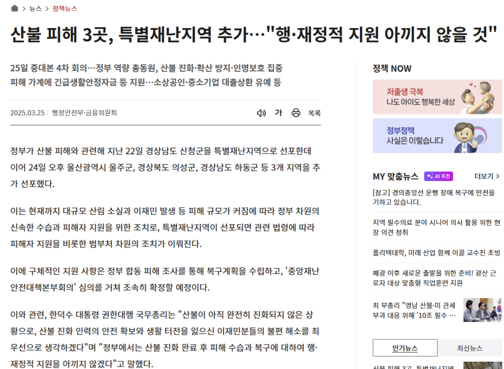 이에 따라 정부는 산불 피해를 입은 주민들을 위해 재난 지원금을 지급하기로 하였습니다.
