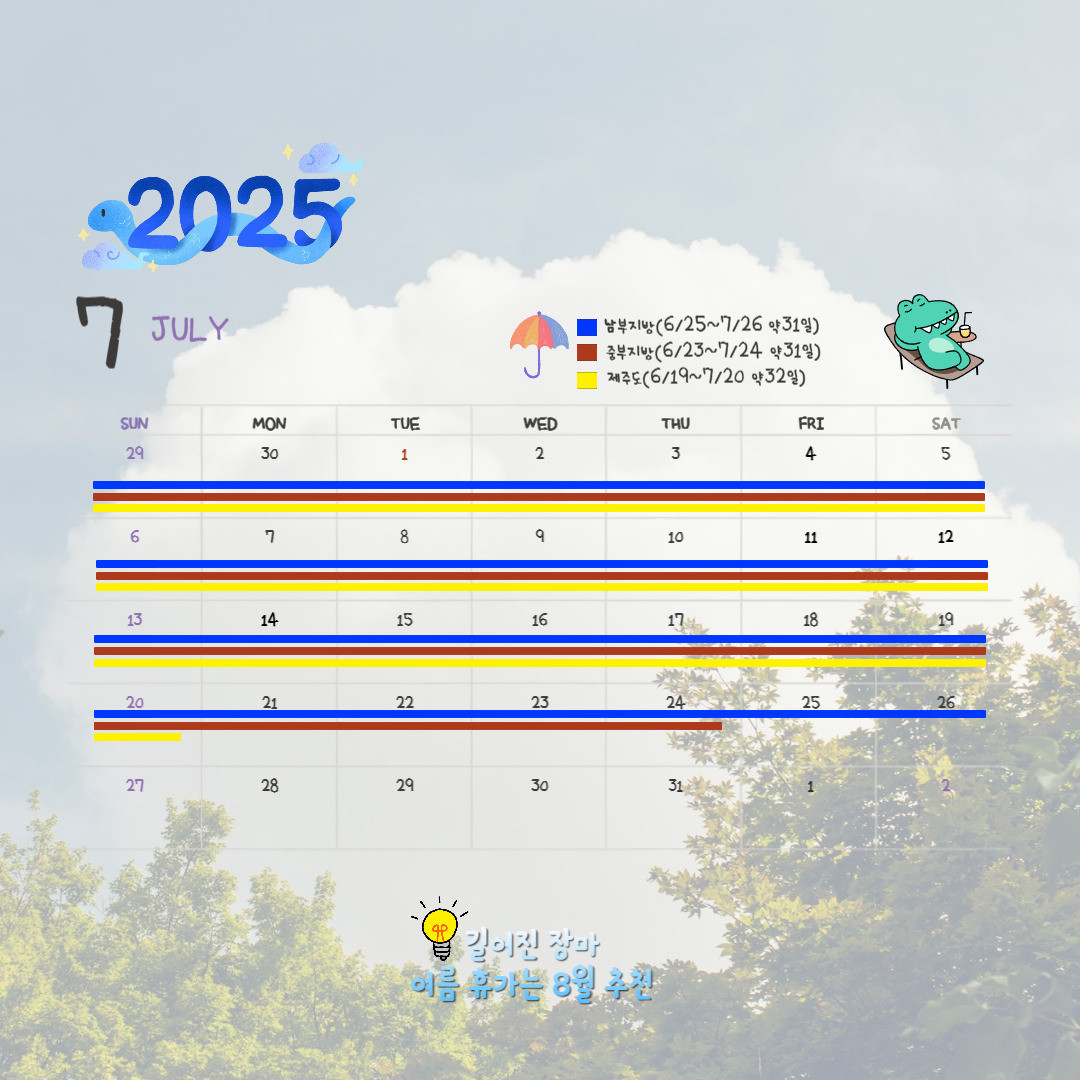 2025년 장마는 6월 하순부터 시작될 것으로 보이며, 7월에는 비가 자주 내릴 것으로 예상됩니다.