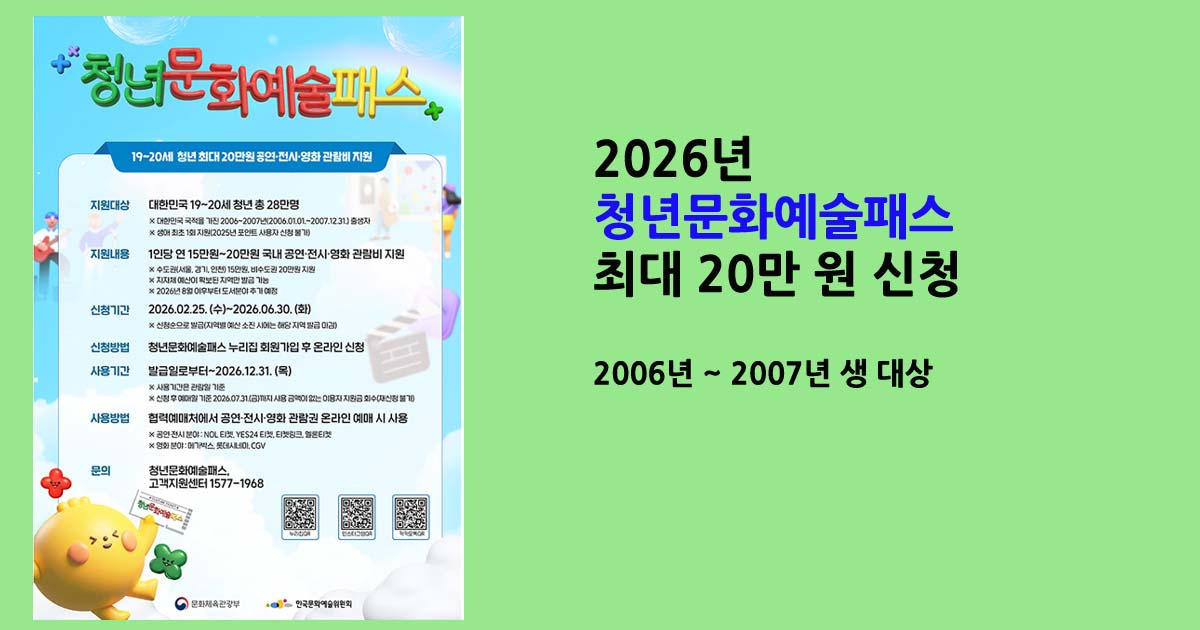 2026년 청년문화예술패스는 2006~2007년생 청년(만 19~20세)을 대상으로 공연·전시·영화·도서 구입 등 문화생활을 지원하는