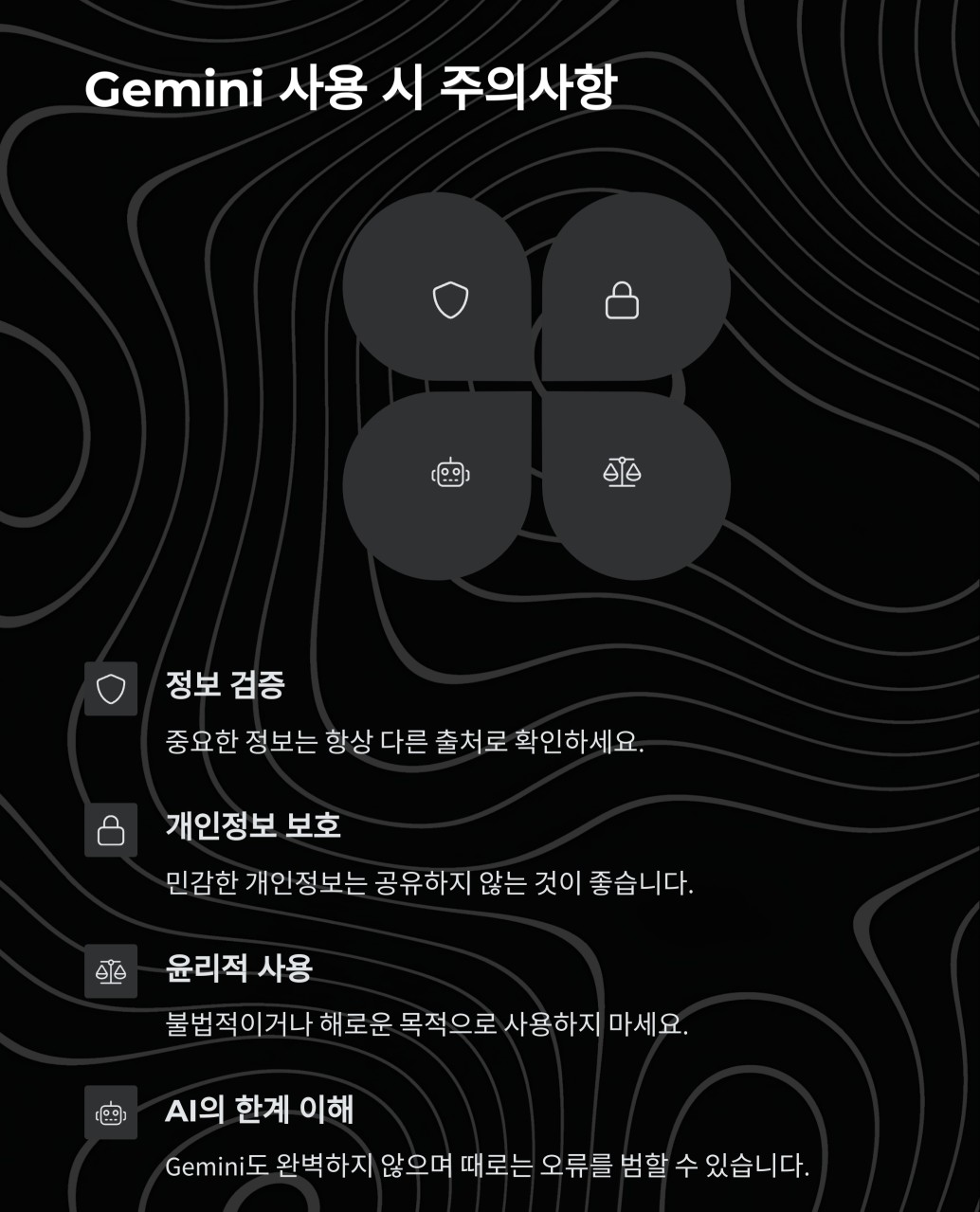 - 피드백을 주면 더 똑똑해져요: 만약 Gemini의 답변이 마음에 들지 않거나, 더 보완되었으면 하는 부분이 있다면 '엄지손가락 내리기' 버튼 등으로 피드백을 줄 수 있습니다. 여러분의 피드백은 Gemini가 더 나은 답변을 학습하는 데 큰 도움이 됩니다.